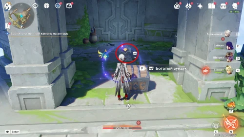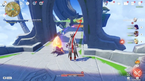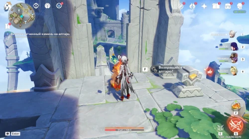 Для сбора первого огненного камня, расположенного на северо-восточном парящем острове, пройдите по мосту справа от алтаря, который находится напротив от Боны (смотрите скриншот ниже), а затем поднимитесь на подъемнике вверх.