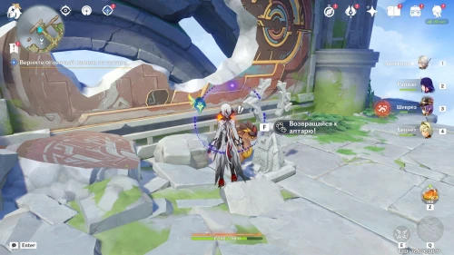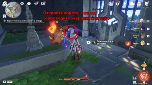 Затем вернитесь к спутнику-завриану и вновь взаимодействуйте с ним, чтобы он пошел к алтарю. Вам остается лишь сопроводить его к центру области.