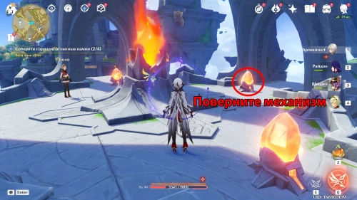 Подойдите к пьедесталу и нажмите «Активировать» для поднятия платформы вверх. Затем попросите тепетлизавра вернуться к алтарю. Следуйте за ним, пока не дойдете до края моста. Начнется заставка, в ходе которой Бона сменит расположение механизма. Активируйте подъемник, чтобы поднять мост, а потом снова взаимодействуйте с малышом, чтобы он донес огненный камень до алтаря.