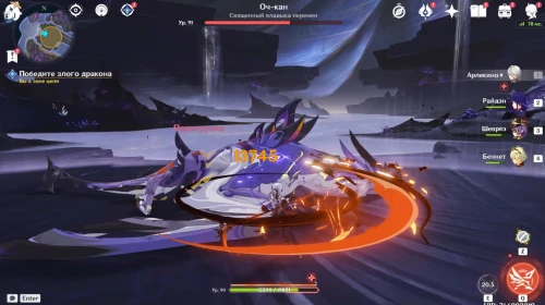 Заранее отметим, что сражение с Оч-каном во многом напоминает битву с Кукузавром-тираном золотого пламени, однако есть несколько разительных отличий. Во-первых, противник будет иногда переходить в режим зарядки, во время которого вам нужно бить его элементальными атаками (желательно с характеристикой Ночного духа), чтобы поскорее сбить его щит и повалить на землю. В ином случае он выполнит мощную атаку по площади.