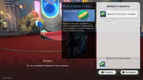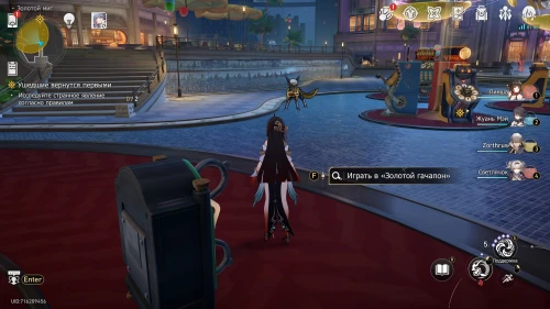 Затем вы можете изучить одно из двух новых мест. Мы сначала пошли к золотому гачапону. Подойдите к автомату и сыграйте в него. Вам потребуется найти аттракционную крышку от «Услады». Для этого сразу же развернитесь, и вы увидите гончую из труппы «Кошмарики». Подойдите к ней и выменяйте крышечку на люцернии. Возвратитесь к гачапону и положите в него особый «жетон».