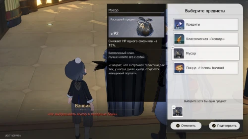 Далее направляйтесь к 4-му месту, находящемуся на севере, и представляющему собой мусорный бак. Правило гласит, что в него нельзя выкидывать мусор. Далее вам нужно будет выбрать, что в него кинуть: кредиты, мусор, пиццу «Часик» или классическую «Усладу». Любой выбранный вами предмет будет переработан в Приятный на вид мусор. Так что мы советуем вам бросить обычный мусор.