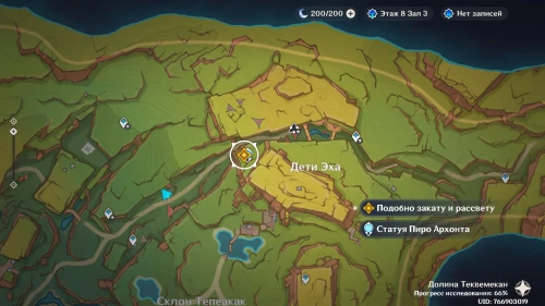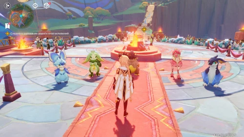 Пройдите еще дальше на восток по дороге и подойдите к тепетлизавру по имени Ханви. Затем бегите за ней – она приведет вас к своему малышу Айо. Вы поможете ему справиться с болезнью, передав эликсир. Теперь переместитесь к статуе Пиро Архонта возле поселения Детей Эха и посмотрите новый ролик.
