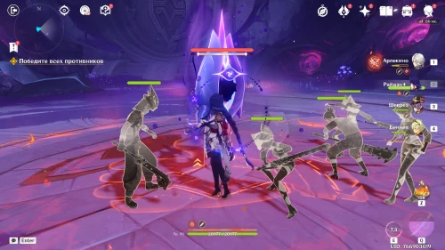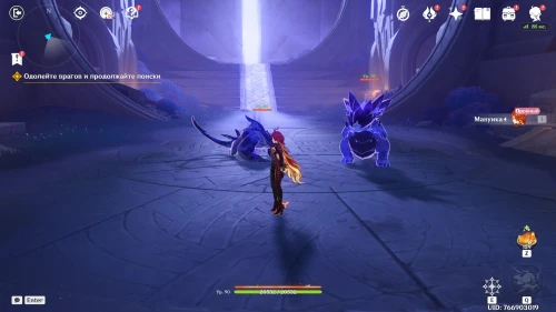 Затем вы снова переключитесь на свой отряд. Бегите вперед к арене и вступите в схватку с гончими разрыва. В этой битве вам помогут ваши друзья из Натлана, которые погибли в прошлом. Речь идет о Нечке и Атее. Когда убьете противников, снимите барьер с врат Бездны с помощью элементальных атак, а потом уничтожьте их.
