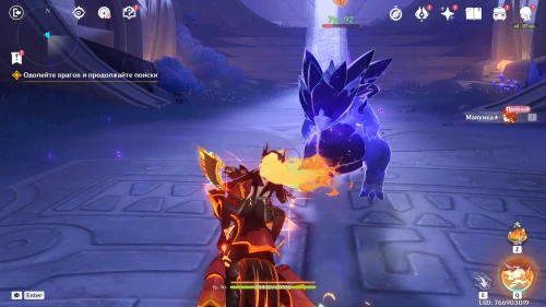 Отметим, что первой атакой босса станет удар мечом по площади, наносящий Пиро урон. На земле при этом остается огненный след, наносящий периодический Пиро урон, если стоять на ней. Данная атака вас не убьет, однако сразу же примените свой элементальный навык (долгое нажатие), чтобы сгенерировать энергию для последующего взрыва стихии.