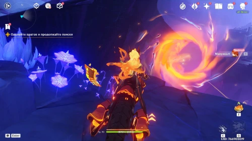 Затем появятся мимифлоры, которых легче всего тоже уничтожать с помощью элементального навыка – зажмите клавишу «Е», а потом выполняйте обычные атаки, выпуская огненные лезвия во врагов. После этого противник должен упасть на землю, и вы сможете спокойно ударять его.