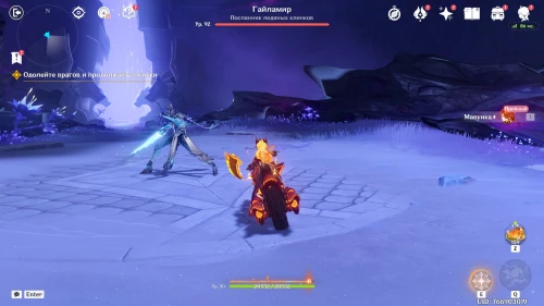Когда дойдете до флогистонового потока, призовите мотоцикл (долгое удержание Е-шки) и просто запрыгните в огненное кольцо. Езжайте вперед к следующей арене и расправьтесь с посланником ледяных клинков Гайламиром, используя ту же тактику, что и раньше. Разобравшись с врагом, поговорите с Хини.