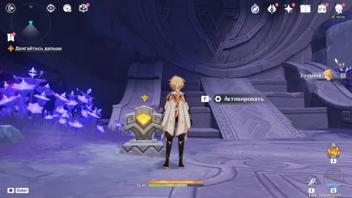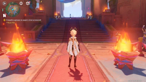 После приземления воспользуйтесь консолью для открытия прохода. Встаньте на площадку, где вы получите благословение от прошлых героев Натлана. Затем продолжайте бежать вперед по световым мостам, поднимаясь все выше и выше. В итоге вы попадете в сердце Царства Ночи.