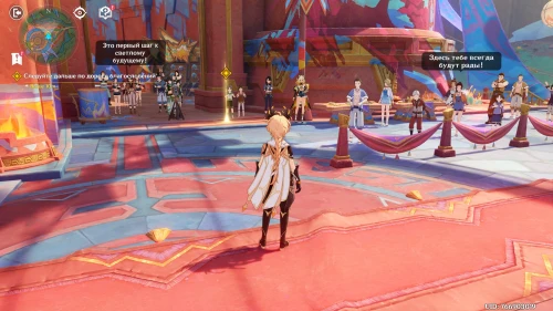 Осмотритесь у врача, а затем пообщайтесь с друзьями. Затем вы автоматически перенесетесь на стадион, где будет проводиться церемония чествования Путешественника. Просто пройдите вперед и возьмите корону, которую вам преподнесет Часка.