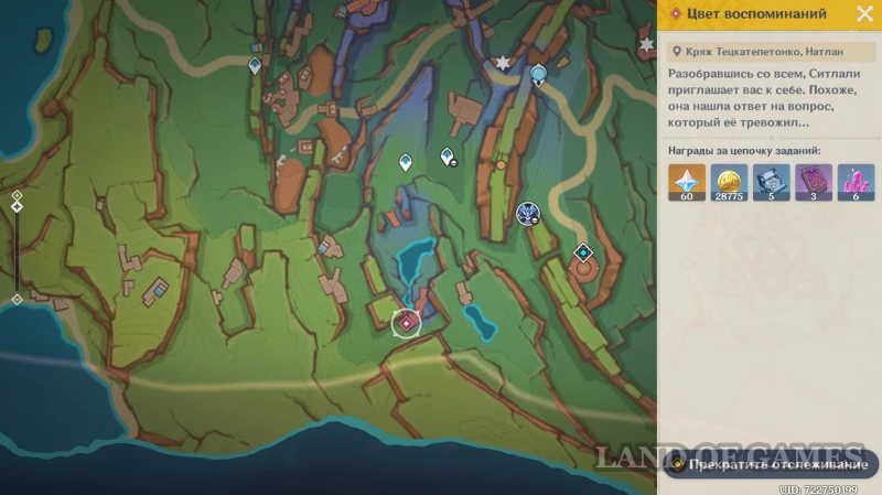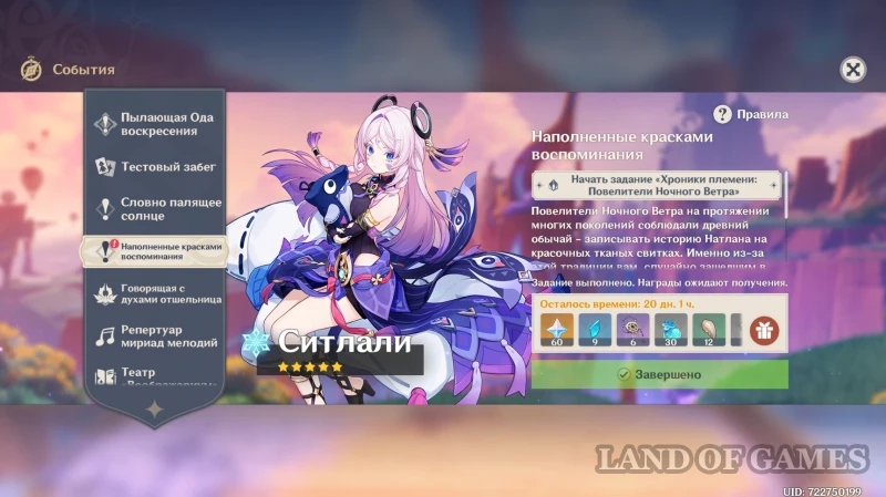 - Награда из вкладки ивента «Наполненные красками воспоминания»: 60 примогемов, 30 плодов квенепа и другие материалы для возвышения Ситлали.