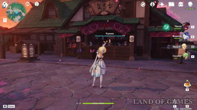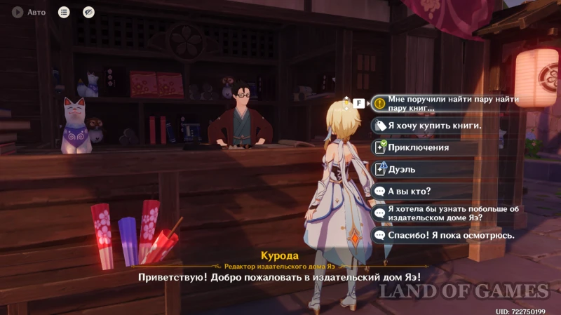 После основного квеста не забудьте посетить издательский дом Яэ, расположенный в столице Инадзумы (смотрите точное место на скриншоте выше). Вступите в диалог с Курода и выберите самый первый ответ «Мне поручили найти...» под восклицательным знаком. После рассказа о Ситлали, впечатленный редактор решит подарить оба издания романа.