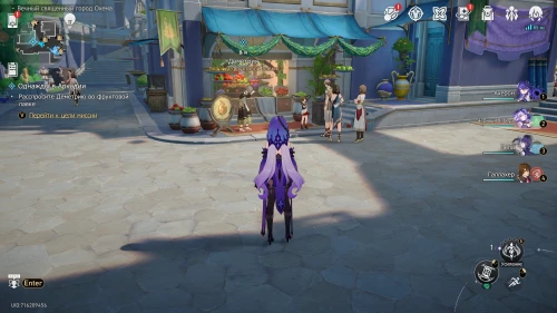 Возвратитесь в Охему и телепортируйтесь на «Мраморную ярмарку», а потом пообщайтесь с хозяйкой фруктовой лавки Деметрией. К сожалению, она не сможет ответить на ваши вопросы. Далее поговорите с Ктесифоной, управляющей книжной лавкой. Она отметит, что Аркадия является вымышленным местом.