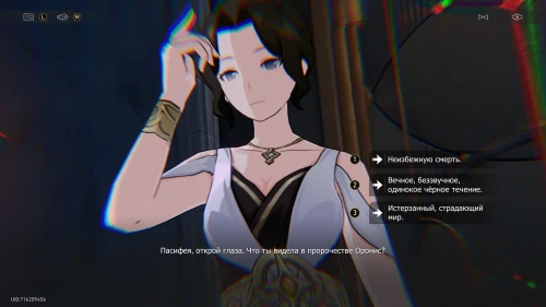 Вас спросят, что она увидела в пророчестве Оронис – можете выбрать любой вариант, так как он ни на что не повлияет (лишь слегка изменятся диалоги). Затем вам зададут вопрос, кем бы стала Пасифея, если бы все сложилось иначе: воином, ученой или ремесленником. Опять же можете выбрать любой ответ, так как он просто немного изменит диалоги.