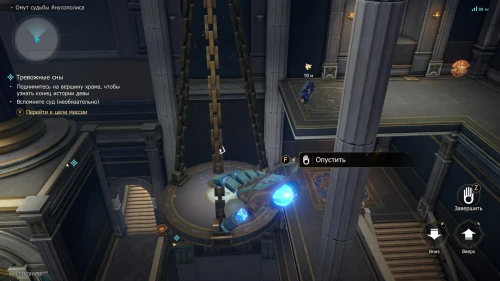 Далее выйдите из режима управления ладонью, поверните камеру налево, и вы увидите левую чашу весов. Вам необходимо будет встать на нее, чтобы подняться наверх и получить ачивку «Балансируя». Оказавшись наверху, пройдите вперед и подойдите к Пасифее, чтобы узнать конец истории девы.