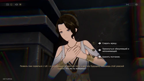 Теперь перейдите на другую сторону и подойдите к девочке и Пасифее. Далее вам нужно будет ответить на 3 вопроса, выбирая различные реплики. К сожалению, ни один из этих ответов ни на что не повлияет, то есть Пасифея все равно смирится со своей судьбой и станет девой Оронис.