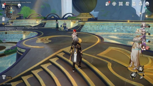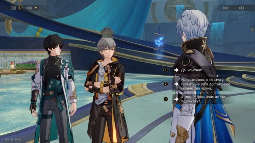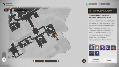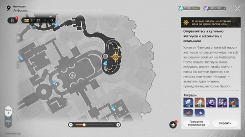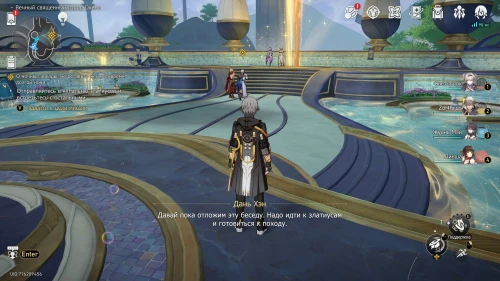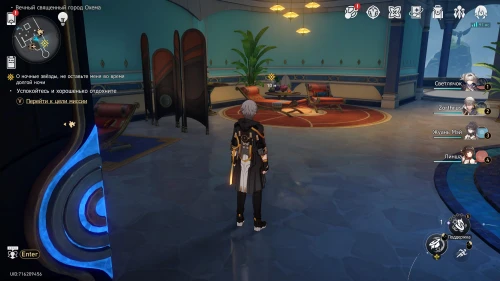 Далее откройте карту, выберите Охему и нажмите на пространственный якорь «Зал отдыха», находящийся возле вашей личной купальни. Пройдите в свою комнату и лягте на лежанку, чтобы отдохнуть. Послушайте разговор между Аглаей и Трибби. Проснувшись, вы услышите странный голос и решите рассказать о нем Дань Хэну, стоящему на балконе.