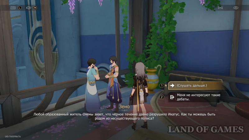 Итак, мыслители спорят о реальности Икатуса – полиса, который по существующим сведениям сгинул в черном течении. После нашего согласие на участие в споре (выберите в начале разговора ответ «Позвольте мне вступить в дискуссию!»), придется сделать выбор: