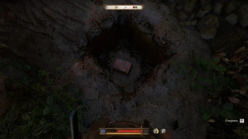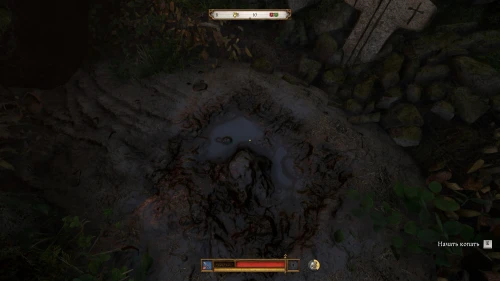 Подойдите к кресту и взаимодействуйте с ним, чтобы сдвинуть его в сторону. Далее начните копать под крестом, используя лопату. В итоге вы обнаружите небольшой сундучок, внутри которого будут лежать: