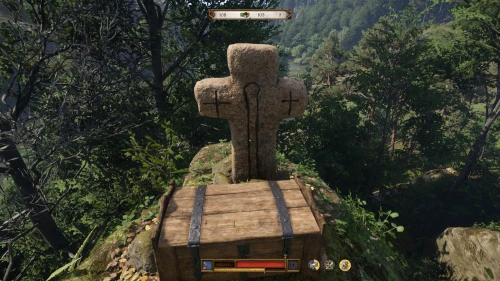 Продолжайте бежать по дороге на северо-запад, пока не окажитесь в месте, которое показано на карте ниже. Поверните камеру на юг от дороги и начните двигаться в чащу леса, поднимаясь на холм с большими каменными выступами. Отыщите расщелину в одной из скал, и вы обнаружите очередную придорожную часовню с крестом и свечами.