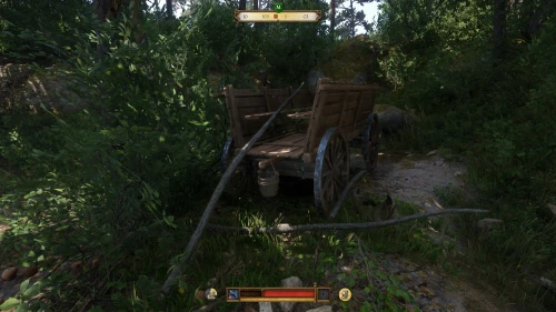 Слезьте с коня, а затем развернитесь и пройдите немного по дороге назад, и вы увидите справа от нее еще один мешок с углем. Продолжайте углубляться в лес, идя по тропинке, пока не увидите слева пропавшую тележку – осмотрите ее. К сожалению, она окажется пустой. Позовите своих товарищей, а потом вместе с ними идите через лес.