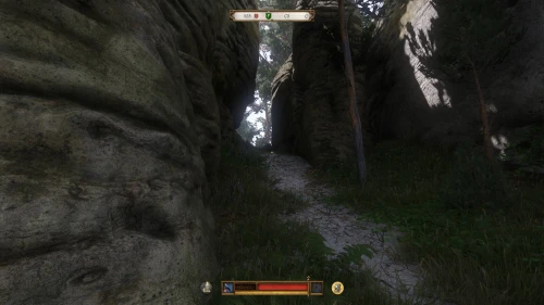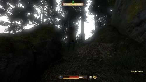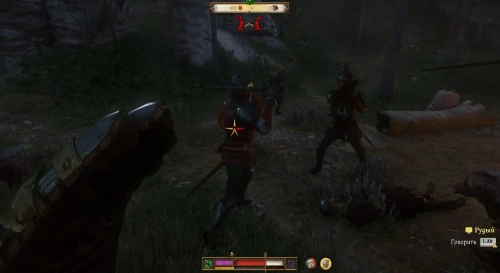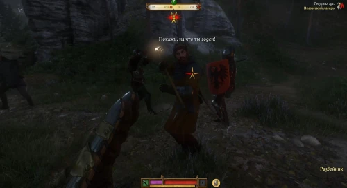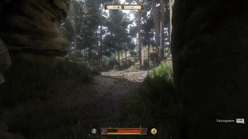 Пройдите чуть вперед, а затем сверните влево и поднимитесь наверх по тропинке между двумя скалами. Не выходите на свет и пригнитесь, а когда увидите трех бандитов впереди, нажмите «L.Alt», чтобы подслушать их разговор. Если вас заметят, то текущая задача будет провалена и сразу же появится цель «Напасть на дозор», и вам придется сразиться в одиночку с тремя бандитами, что на данном этапе игры будет крайне сложно.