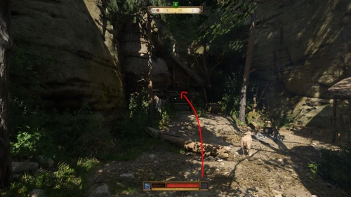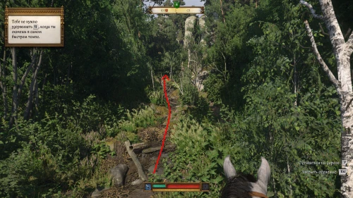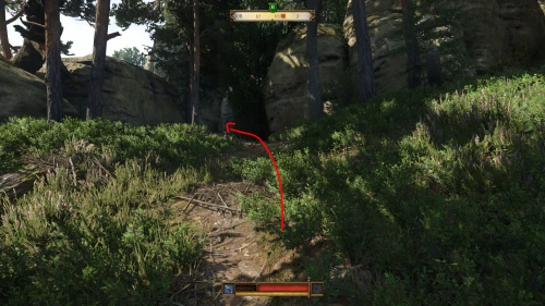 После разговора с женщиной на вашей карте появится новый маркер, указывающий на лес к северо-востоку от Тросковицы. Идите по дороге в сторону, идя сначала на восток, а потом прямиком на север. Войдя в выделенную область, сверните с дороги налево, и вы увидите тропку, уходящую наверх, – двигайтесь по ней до развилки. Затем сверните влево и пройдите между камней. Затем сверните вправо и идите в ущелье.