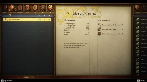 Нажмите на наковальню и в открывшемся меню выберите чертеж «Меч отшельника», который находится в разделе «Длинные мечи». Для его создания потребуется: Сломанный меч Амброжа, франкфуртская сталь х1 и железный лом х2. Все эти материалы передаст вам Радован.