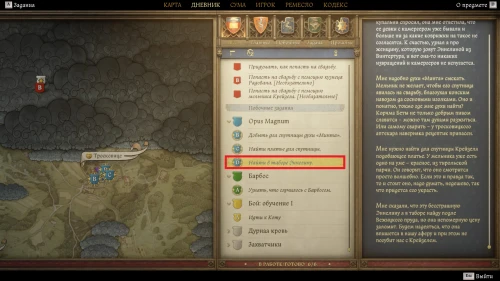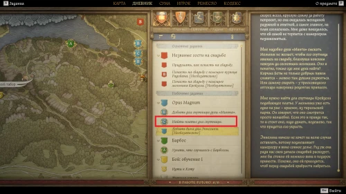 Квест «Opus Magnum» появится в вашем журнале после того, как вы отыщите селитряную яму в рамках задания «Запретный плод». Переговорите с Крейзелем в локации Мельница в Нижнем Семине и примите его предложение помочь попасть на свадьбу. Вместе с этим мельник даст вам задание найти алхимическую книгу из замка Троски. Чтобы добраться до панских покоев, вам придется найти спутницу для камергера.