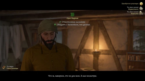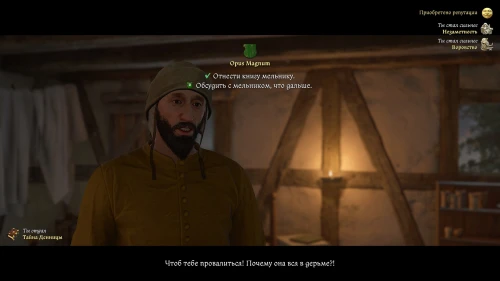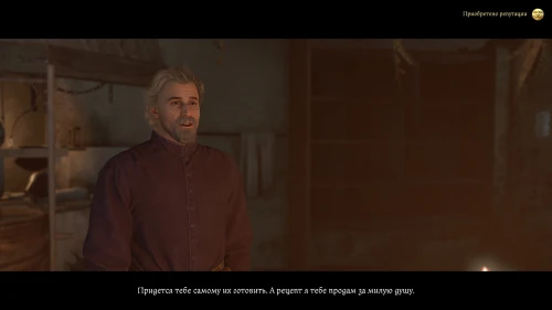 Чтобы получить немного репутации, выбирайте следующие диалоги: «Ты дашь мне новое поручение» > «Промолчать» > «Оружие» > «У тебя была хорошая мать» > «Ты вылетел?» > «Алхимия?» > «Ты стал мельником?» > «Давай за дело приниматься».
