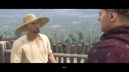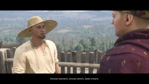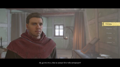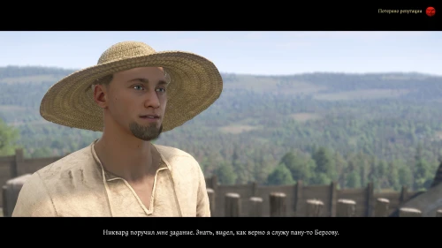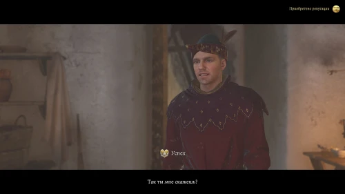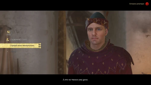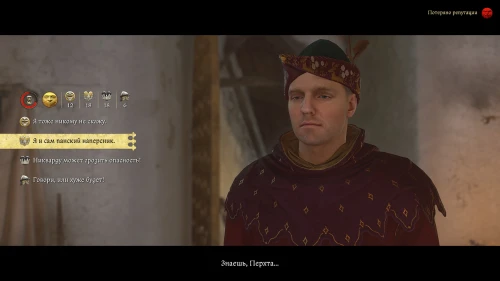 Чтобы получить дополнительную репутацию выбирайте следующие ответы: «Слава о тебе поперед тебя бежит» > «На двух коров хватит» > «Тебя будут вкусно кормить» > «Там можно на лошадей поглядеть» > «Пан Бергов там будет» > «Тебе надо… с ним познакомиться» > «Извини» > «Насчет книги в Тросках» > «Я расспросил про камергера в бане» > «Значит, договорились?» > «Добуду я тебе вина».