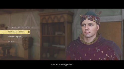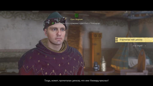 Выберите следующие варианты диалога: «Слушай меня внимательно» > «Я и сам панский наперсник». В случае, если вы успешно пройдете проверку на обаяние, Перхта расскажет о том, как помогла Никварду пережить несчастный случай в нужнике. Однако, данной информации будет недостаточно, чтобы узнать где сейчас находится Никвард вместе с искомой книгой.