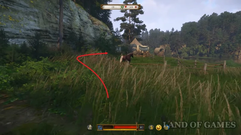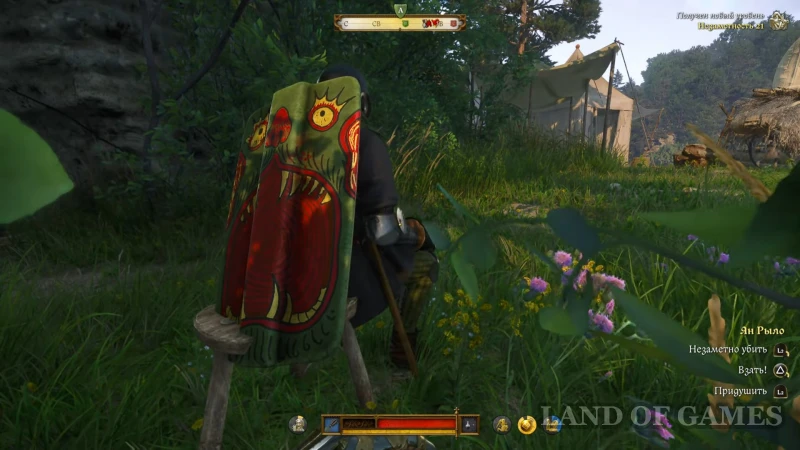 Также есть вариант со скрытным началом боя. Предлагаем вам попытаться обойти лагерь слева через кусты, ведь в дневное время суток на стуле за ареной сидит мужчина с примечательным щитом — именно он нам и нужен. Можно осторожно придушить Яна Рыла и отнести его подальше от лагеря, забрав щит и ключи. Затем вы можете вернуться и ликвидировать незаметно столько врагов, сколько сможете, а когда удачливость ассасина вам изменит — принять бой.