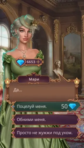 - Ваших поцелуев, а не слов (тратим 77 кристаллов и открываем сценку с ними; получим ачивку «Пламя на двоих»).