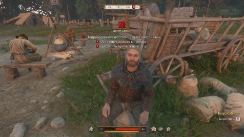 Теперь вам придется поднять и загрузить в телегу 5 мешков с припасами. После того как Индро закинет последнюю поклажу, батрак обратится к вам с благодарностью. Чтобы заручиться его поддержкой в дальнейшем, выберите вариант «согласиться».