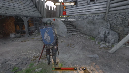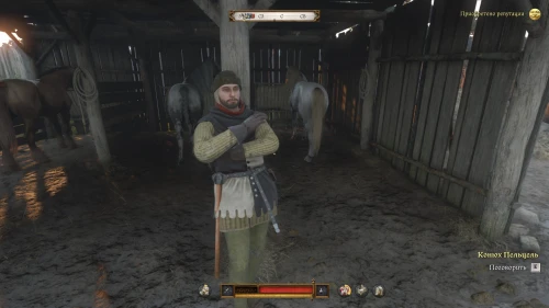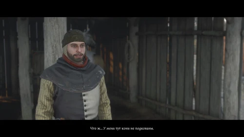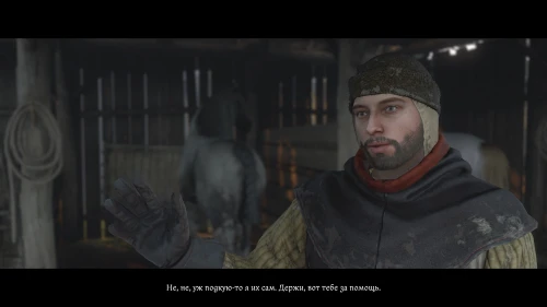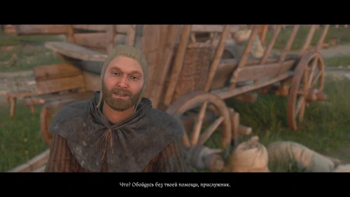 Бегите во двор и отыщите телегу справа от конюшни. Чтобы начать задание, поговорите с батраком Кекалом, сидящим рядом с мешками. Вам придется пройти несколько проверок, чтобы успокоить разозленного после недавней резни бандита.