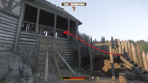 После начала битвы, вы получите указание сбить все лестницы со стен замка. Для этого вам понадобится специальное оружие — вульж. Следуйте вправо от места начала данного задания и заберите алебарду из небольшой каморки.
