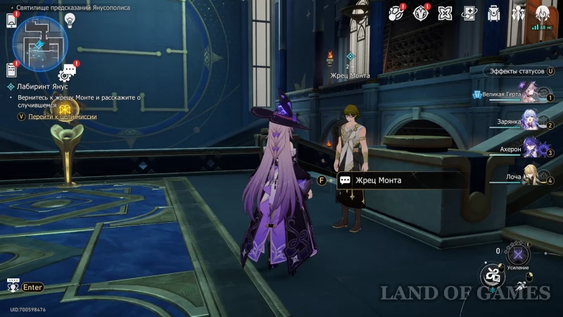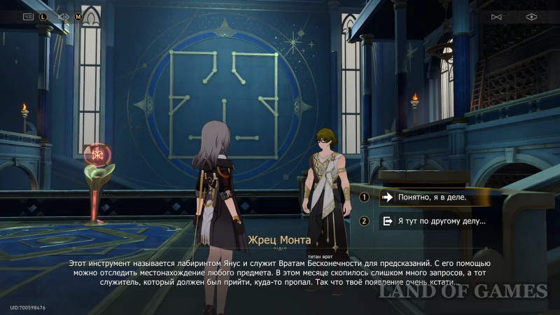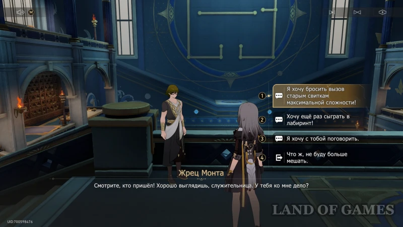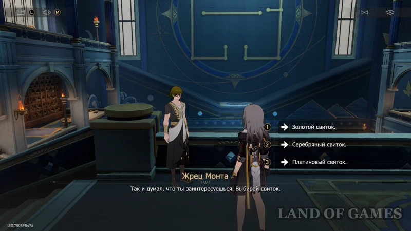 После рассмотренной выше миссии «Лабиринт Янус», вы можете вернуться в Святилище провидения к жрецу Монту — теперь он будет помечен на карте значком загадки в Библиотеке пророчества. Заговорите со служителем и выберите первый вариант ответа «Я хочу бросить вызов...», после чего определитесь с названием древнего свитка и бегите к механизму, запускающему головоломку.
