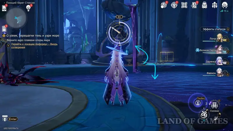 - Находясь в углу, зажмите способность так, чтобы сфера покатилась и попала на движущийся участок — с него нужно упасть влево (для этого нужно аккуратно балансировать нажатием навыка, пока платформа находится в движении);