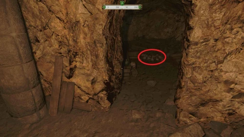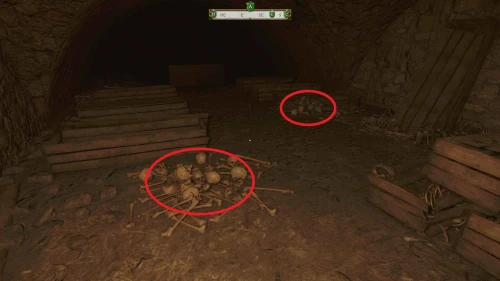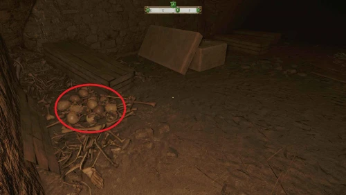 Идите в северо-восточный угол помещения и взаимодействуйте с двумя кучами на полу, а потом осмотрите полку с костями слева и еще одну кучку черепов справа возле досок.