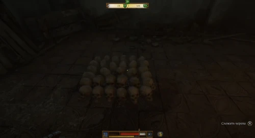 Пирамиду из черепов следует разложить в северо-восточном углу помещения. На данный момент времени вы сможете поместить здесь 28 черепков.
