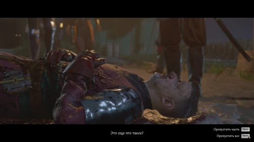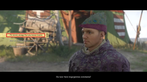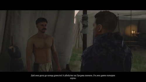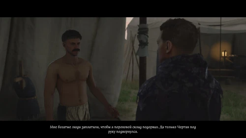 Теперь, следуйте в палатку к Катцу и выберите абсолютно любую реплику. Далее вы переместитесь в палатку Мусы, где находится уже мертвый Чертан. В следующий момент в палатку войдет тот самый Грозав, обвиняя Мусу в убийстве.
