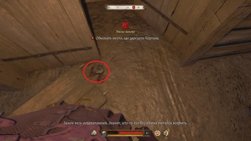 Улика 2: осмотрите окровавленный замок у сарая с пищалью.