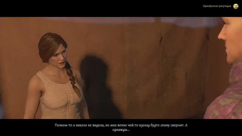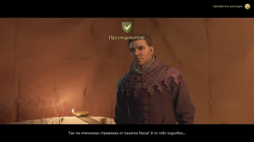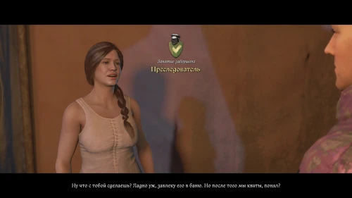 Данное задание вы получите лишь выбрав соответствующую реплику в прошлом разговоре с Катцем. Следуйте в купальни и поговорите с Катериной. Попросите ее отвлечь стражника, охраняющего Мусу, чтобы поговорить с ним. В свою очередь, Катерина попросит вас об одолжении: кто-то следит за ней с тех пор, как она прибыла в лагерь. Согласитесь найти подглядывальщика и начните дополнительное задание «Преследователь».