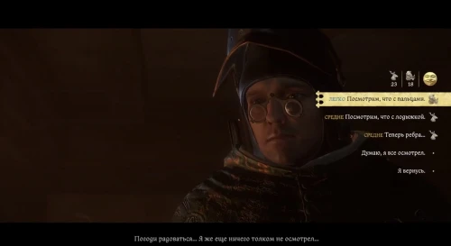 Вы узнаете, что пленника зовут Гинек из Хобжи. Он попросит у вас еды в обмен на информацию. Можете дать ему любую имеющуюся у вас пищу (мясо) или убедить его рассказать вам, пройдя проверку на Внушительность (средне). Он расскажет, что Петр скончался, а его тело собираются вывезти.