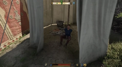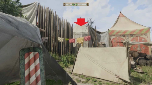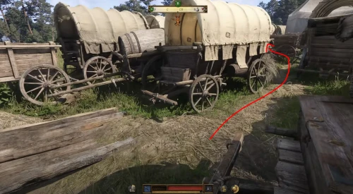 В конце беседы можете предложить Гинеку освободить его, чтобы поднять репутацию, однако он в любом случае ответит отказом, так как вскоре должен прибыть его отец вместе с выкупом. Итак, выйдите из палатки и отправляйтесь к северо-восточной части ограды лагеря, позади бань (смотрите скриншоты ниже). Здесь вы обнаружите кучу повозок – пройдите мимо них, и в открытой тележке вы найдете завернутый труп, который следует осмотреть.