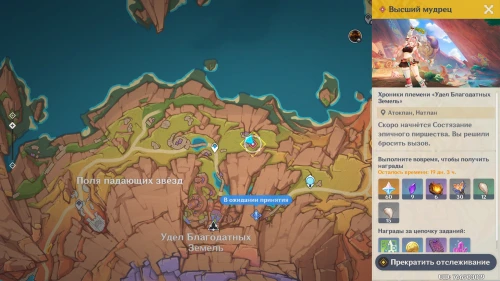 Разобравшись с указанными выше требованиями, перейдите в раздел «Задания легенд» в журнале, а потом откройте категорию «Хроники племен» и кликните по панели «Тетеокан: Удел Благодатных Земель», а затем начните отслеживание третьей главы.