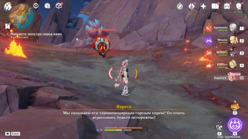 Внезапно вас атакует Термопанцирный горный хорь – элитный враг данного региона. Советуем вам использовать против него стандартную комбинацию Варесы – применяете элементальный навык (клавиша «Е»), затем заряженный удар (быстрый клик по ЛКМ) и в конце ульту (клавиша «Q»). Можете применять данное комбо два раза подряд.