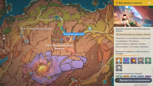 Отправляйтесь в Удел Благодатных Земель и снова поговорите с жителями племени в столовой. Гляньте ролик с готовкой грибов на сильном огне. Зеленые грибочки станут выделять странный туман. В результате вы с Паймон и Варесой переместитесь в неизвестную область.