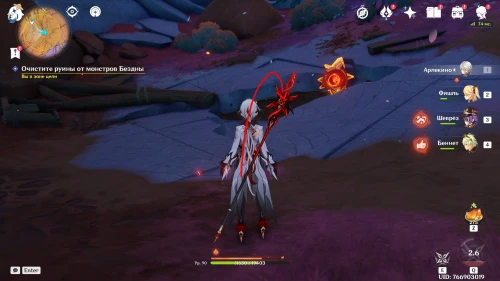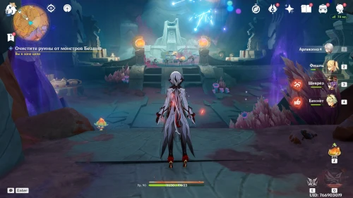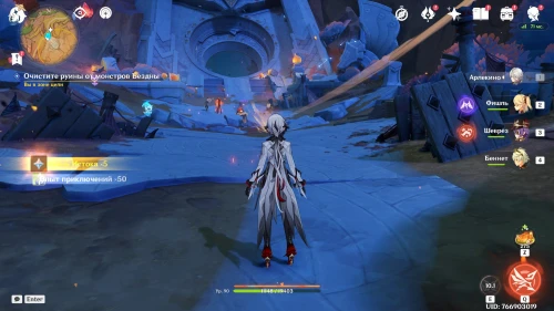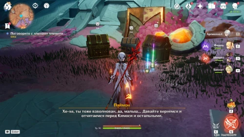 Превратитесь в татанказавра с помощью фиолетового камня трансформации и начните бежать наверх, круша булыжники (нажмите ПКМ дважды) в усиленном спринте. Добравшись наверх, вы столкнетесь с группой хиличурлов – расправьтесь с ними.