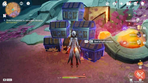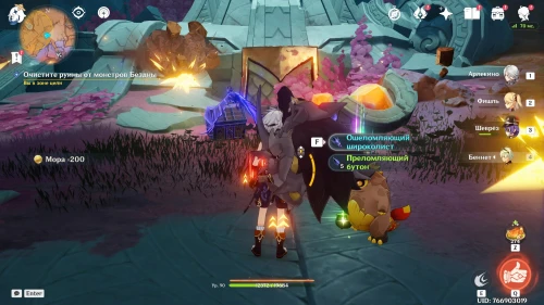 Теперь идите вглубь пещеры. Внутри вы обнаружите еще одну группу врагов. Уничтожив хиличурлов, подойдите к кучке богатых сундуков и взаимодействуйте с ней. После этого сверху на вас начнут падать камни, а внизу вы подвергнетесь атаке сумрачных мимифлор и щенков разрыва.
